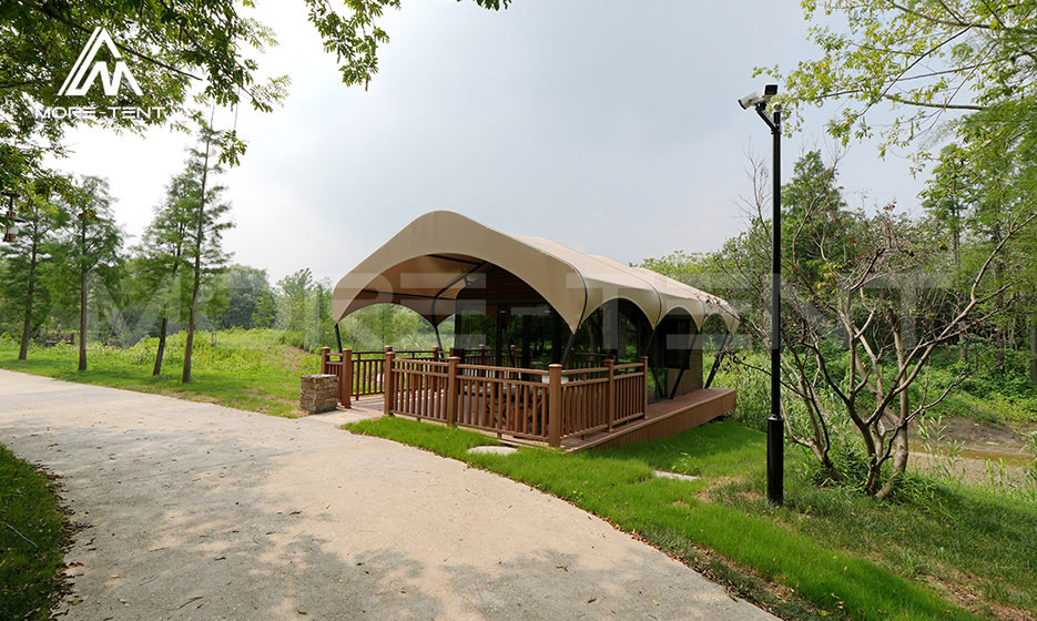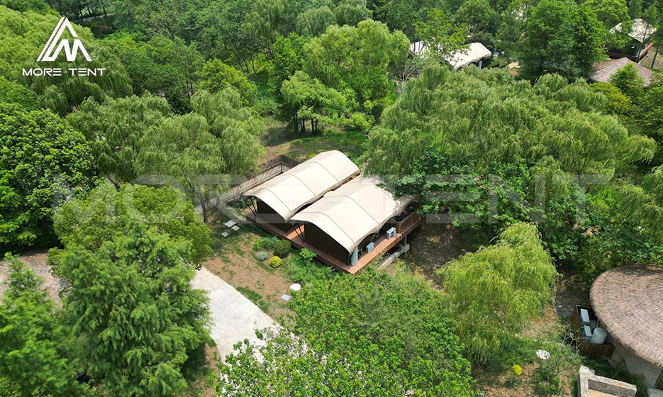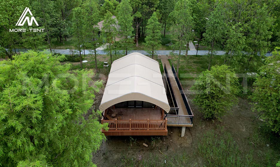 MORE TENT glamping tents adopt a factory-prefabricated production model, achieving zero construction waste from the source and effectively reducing environmental pollution. The application of dedicated platform systems minimizes damage to surface vegetation and fully protects the natural ecology. At the same time, the tents use high-strength aluminum alloy structures and durable PVC fabric, ensuring harmonious integration with the natural environment while extending the service life of the tents.